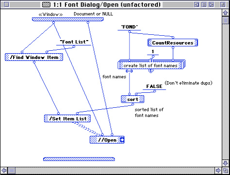 Prograph also had an interface builder along the lines of Visual Basic. You could draw windows with widgets, and assign events to execute code. The code could compile to a regular Mac executable that you could distribute.