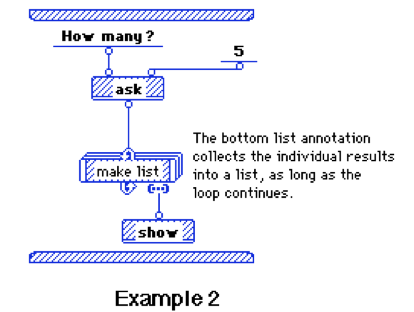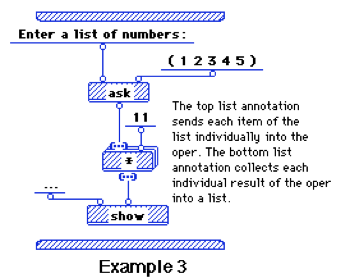 Other language semantics were handled by annotations to either the input or output of a function. You could turn any input dot into an ellipsis and Prograph would then expect the inflow to that dot to be a list, it would then automatically run the function once for each element in the list — there’s your each. You can similarly make one of the outputs an ellipsis, and Prograph will gather the result of each run through the function into a list output — there’s your map. There was an annotation that would take an output and wind it back to the top to become an input on the next loop — there’s your inject. Other enumerable type methods were pretty easy to build on top of those constructs.