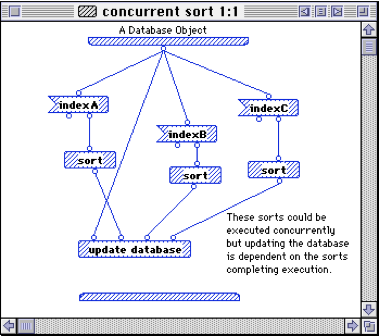 A feature that’s a little less obvious is that, unlike a textual language, the order in which commands happen depends only on the data flow. In the above example, commands happen heading down the screen, but only because each command is dependent for its input on the output of the previous commands. The two literal operations can happen in any order that will allow them to be executed before their dependencies. (I don’t think the 1996 version literally ran in parallel, but the language was certainly set up to encourage parallel thinking.) Here’s a different example that shows three different sorts that could happen in any order.