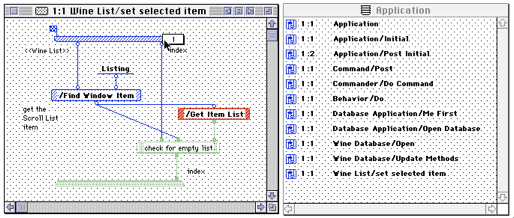 In debug mode, Prograph really took advantage of being a data-flow, basically no side-effect language. You could step through execution, but at any time you could see the data at any point of execution (basically you could mouse over any data circle you could see) even if execution had moved far beyond. So you effectively got a watch on all variables at all times for free. You could also go back in time, undo execution steps, edit the function being called, then redo them with the new code without exiting the runtime. Here’s a screenshot showing the mouse over of a previous bit of data even though the code is later in the flow.